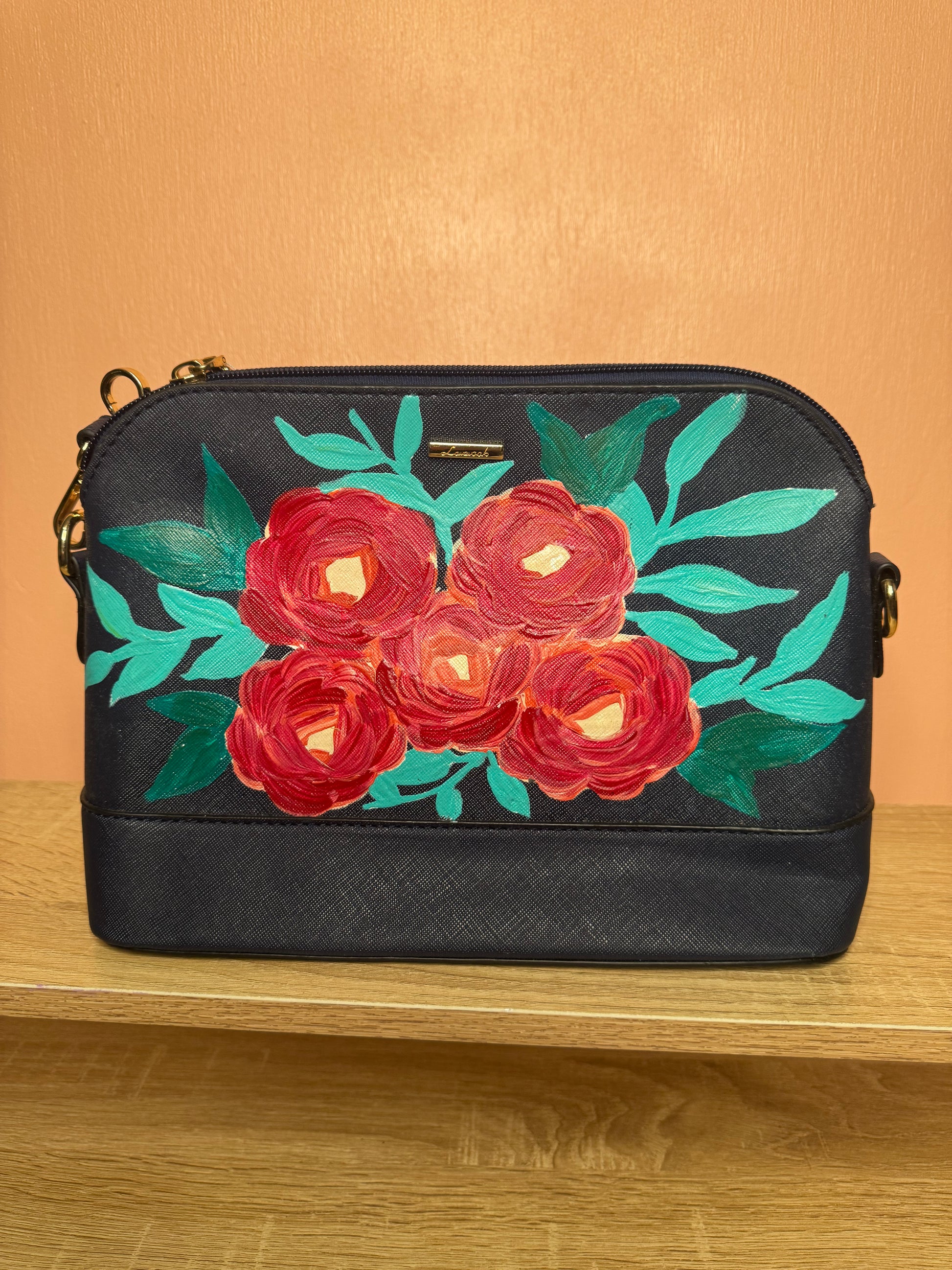 Medium sized faux leather crossbody purse hand-painted with acrylic paint.